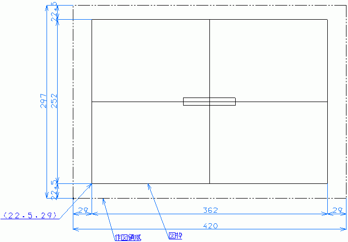 平成 7年度 問 1 解説1.作図領域は、A3(297mm×420mm)の紙の大きさに設定する。紙の大きさはあらかじめ覚えておく必要がある。(なぜA3と判断するかはっきりした根拠は不明だが、問題用紙に記入されているか、記入されて無くても図枠の大きさからA3が最も適していると判断できる。) 2.図枠が作図領域のほぼ中央に来るように、余白の大きさを求める。(420−362)÷2=29 (297−252)÷2=22.5 よって、図枠の左下隅を(29,22.5)とする。 ほぼ中央になれはいいので、図枠がはみ出ていなければ問題ない。 3.原点(0,0座標)は何処でも良い。(多分。)特に問題なければ、作図領域の左下にする事をおすすめする。