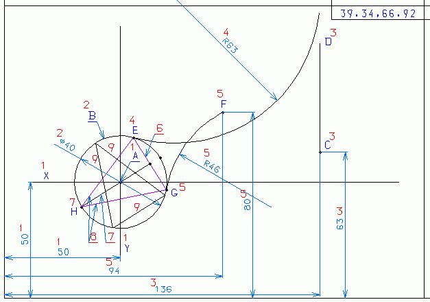平成 7年度 問 5 作図1.点A(50,50)を通過する水平線X及び垂直線Yを区画内に任意の長さで描く。2.点Aを中心とする直径40mmの円Bを描く。 3.点C(136,63)を通過する、垂直線Yに平行な線分を区画内に任意の長さで描く。 これを線分CDとする。 4.線分CD及び円Bにそれぞれ外接する半径63mmの円を描き、円Bと接する点をEとする。解説 但し円の中心点は水平線Xの上方にある。 5.点F(94,80)を通り円Bに接する半径46mmの円弧FGを描き円Bと接する点をGとする。解説 但し半径46mmの円弧の中心点は水平線Xの下方にあることとする。又、円弧FGは円Bに外接する。 6.点E、点Gを結び、この線分をEGとする。 7.線分EGの垂直2等分線を描く。 但し、点Hは線分EGの下方にあることとする。 8.三角形EGHを描く。 9.三角形EGHを点Aを中心として時計廻りに90°回転移動する。