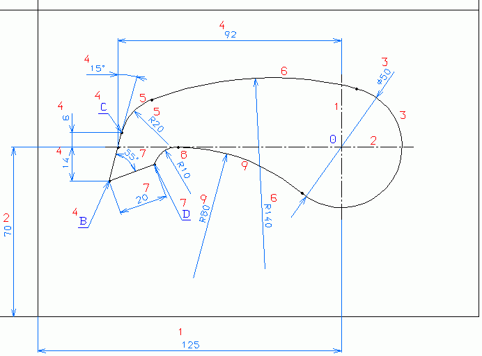 平成 8年度 問 3 作図1.原点から、X座標125に垂直線を描く。2.原点から、Y座標70に垂直線を描き、1.との交点を点Oとする。 3.点Oを中心として、直径50の円を描く。 4.点Oから、相対位置(−92,0)の点を通り、15°の角度の線分BCを描く。 5.線分BCに点Cで接する、半径20の円弧を、1接,1点,半径指示コマンドで描く。解説 6.R20の円弧と、φ50の円に接する、半径140の円弧を、2接,半径指示コマンドで描く。 7.点Bを通り、線分BCに55°の角度で、線分BDを描く。 8.2.の線分に接し、点Dを通る、半径10の円弧を、1接,1点,半径指示コマンドで描く。 9.R10の円弧と、φ50の円に接する、半径80の円弧を、2接,半径指示コマンドで描く。