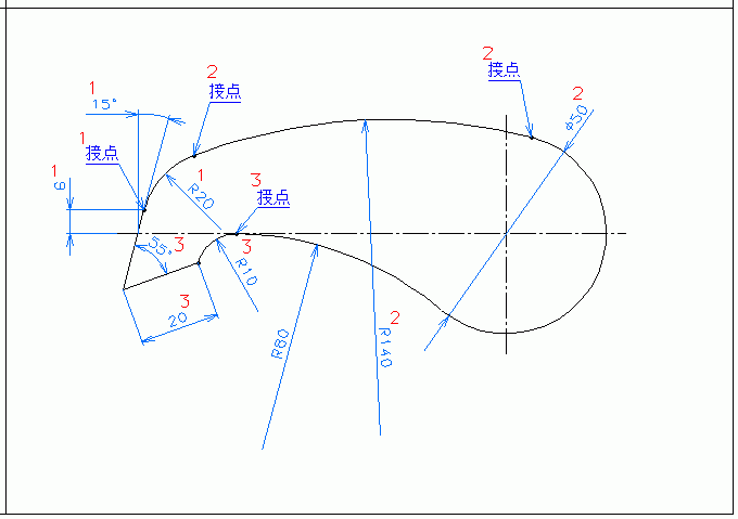 平成 8年度 問 3 解説1.各要素の位置条件を正しく理解する。2.R20は、15°の線分に、6mmの位置で接している。 (1接,1点,半径指示コマンドで作図。) 3.R140は、R20の円弧と、φ50の円に接している。 (2接,半径指示コマンドで作図。) φ50の円と、φ50の円の中心を通る垂直線との交点を通っているように見えるが、 R80が、φ50の円に接しているので、R140も円に接していると考えるのが自然である。 4.R10は、φ50の円の中心を通る水平線に接し、55°の線分上の20mmの点を通っている。 (1接,1点,半径指示コマンドで作図。)
