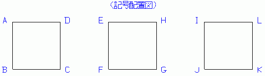 1.区画(ニ)の左下を原点(0,0)とし(50,50)を点Oとする。 2.点Oを基点として、それぞれ(0,40)(40,40)(40,0)を中心とする一辺が25mmの正方形、ABCD,EFGH,IJKLを描きなさい。 中心点(0,40)をABCD、中心点(40,40)をEFGH、中心点(40,0)をIJKLとする。(下記、記号配置図参照) 3.点Oを中心として辺BCと辺IJの2辺に接する最小円Xを描きなさい。 4.辺CDと辺EFの間に任意の長さ中心線Mを描きなさい。 5.中心線Mと円Xとの交点をZとする。但し、交点Zは、点Oよりプラス座標に存在する。 6.交点Zを中心として、頂点Dと頂点Eを通過する円Wを描きなさい。 7.中心線Mと円Wとの交点をQとする。但し、交点Qは、点Oよりプラス座標に存在する。