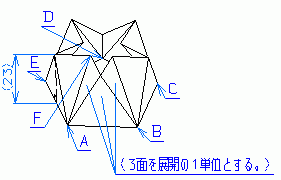 平成 8年度 問13,14,15,16問13 次の立体図に示す容器は平面で作られ、底面は正五角形、上面の星型の各辺は等長で高さ23mmの水平線に沿って開いている。次の指示に従ってこの 容器の展開図を描きなさい。