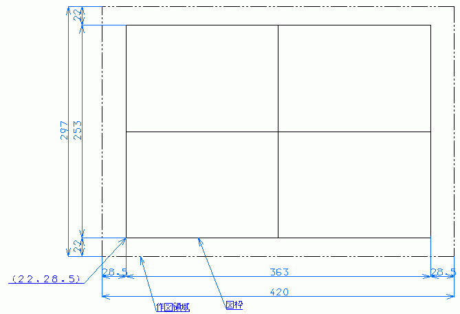 平成 9年度 問 1 解説1.作図領域は、A3(297mm×420mm)の紙の大きさに設定する。紙の大きさはあらかじめ覚えておく必要がある。(なぜA3と判断するかはっきりした根拠は不明だが、問題用紙に記入されているか、記入されて無くても図枠の大きさからA3が最も適していると判断できる。) 2.図枠が作図領域のほぼ中央に来るように、余白の大きさを求める。(420−363)÷2=28.5 (297−253)÷2=22 よって、図枠の左下隅を(28.5,22)とする。 ほぼ中央になれはいいので、図枠がはみ出ていなければ問題ない。 3.原点(0,0座標)は何処でも良い。(多分。)特に問題なければ、作図領域の左下にする事をおすすめする。