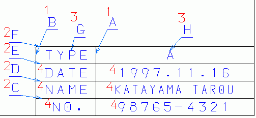 平成 9年度 問 2 作図1.垂直に線分A,Bを描く。2.水平に線分C,D,E,Fを描く。 3.1行分の文字G,Hを入力する。 4.他の3行に間隔6mmで複写する。 5.文字を修正する。