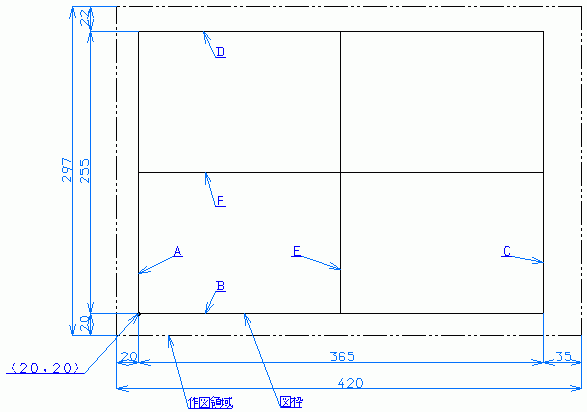 平成11年度 問 1 作図1.X座標20mmの垂直な線分Aを描く。2.Y座標20mmの水平な線分Bを描く。 3.線分Aから右方向に365mm離れた平行な線分Cを描く。 4.線分Bから上方向に255mm離れた平行な線分Dを描く。 5.線分Aと線分Cの中心線Eを描く。 6.線分Bと線分Dの中心線Fを描く。