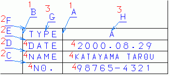 平成11年度 問 2 作図1.垂直に線分A,Bを描く。2.水平に線分C,D,E,Fを描く。 3.1行分の文字G,Hを入力する。 4.他の3行に間隔6mmで複写する。 5.文字を修正する。
