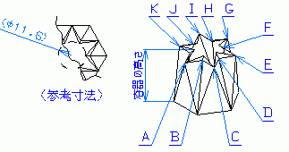 平成11年度 問17,18,19,20問17 立体的に示す容器の3画面を基に参考図に示す位置に三面図を完成させなさい。各頂点をA,C,E,G,I,K,とする。この谷間の頂点を各B,D,F,H,J,L,とする。 このとき、点A,点E,を通る直線上に点B,点Dが配置され、同様に点Eと点Iを通る直線上に点F,点H。点Iと点Aを通る直線上に点J,点Lが配置されている。 容器の高さは27mmとし、底辺から点Aまでの高さは25mmとする。底辺の六角形は直径30mmの円に内接する大きさである。点Aは正面図においての対称(左右)軸上にあるものとする。