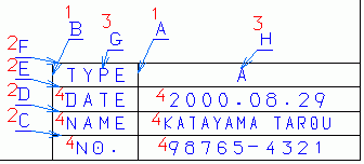 平成12年度 問 2 作図1.垂直に線分A,Bを描く。2.水平に線分C,D,E,Fを描く。 3.1行分の高さ3mmの文字G,Hを入力する。 4.他の3行に間隔6mmで複写する。 5.文字を修正する。