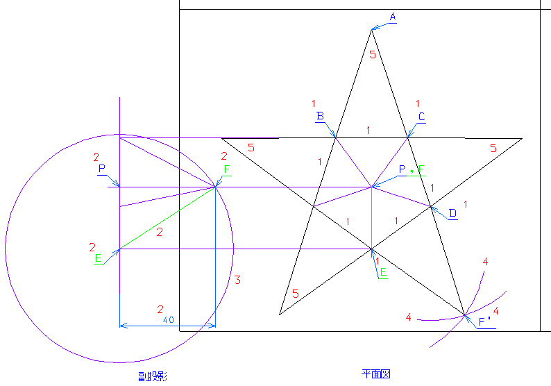 平成13年度(後期) 問 3 作図1.平面図を2次元的に描く。2.副投影で、線分EFを描く。 3.副投影で、点Eを中心として、線分EFを半径とする円を描く。 4.平面図で、点E,Dを中心として、3.の円を平行移動し、2円の交点を点F’とする。 5.平面図で、線分EF’,DF’を、平面図のPを基準として、回転角72°で、4回複写する。