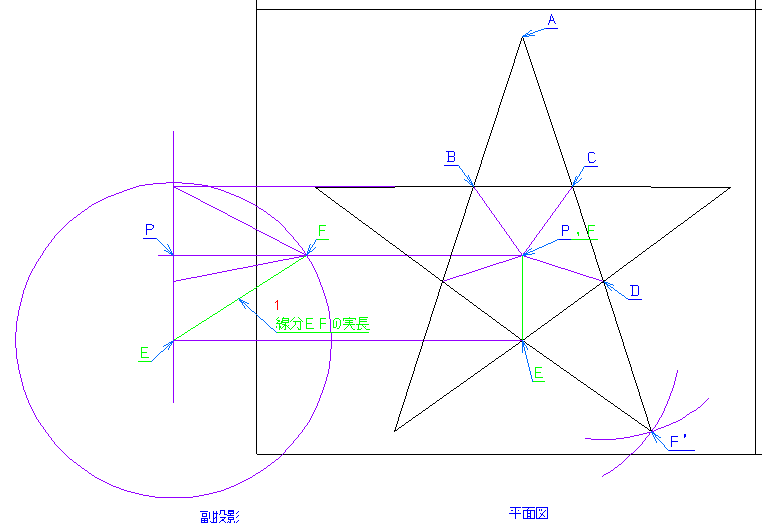 注意点 ・通常展開図は、立体の外面を表にして描くが、CAD利用技術者試験の場合は、内面,外面どちらを表にして描くかは不明。 過去の問題では、どちらで描いても同じ解答になるので、気にする必要は無いが、知識として覚えておくと良い。 ・稜線(面が折れ曲がる線)は、実線で描く。 参考図の稜線は破線になっているが、問題文の1行目に、「・・・図形を実線で描きなさい。」とあるのでそれに従う。現在は、指示が無ければ、稜線は実線で仕上げる。らしい。 ・AからF’は、一直線にならない。 問題 解答 解説 作図 CAD利用技術者試験トップへ |