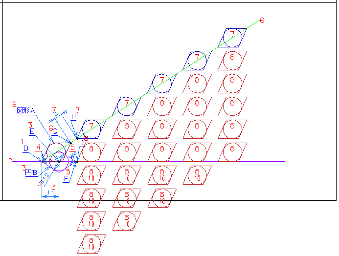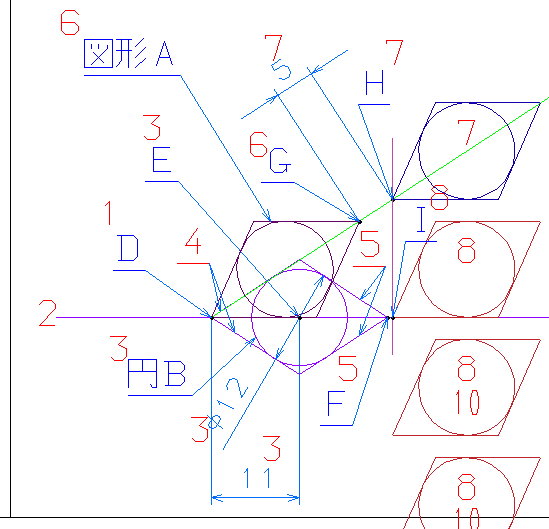 平成13年度(前期) 問 4 作図1.点Dを描く。2.点Dを通る水平線を描く。 3.点Eから右方向に11mm離れた位置を点Eとし、点Eを中心点とする直径12mmの円Bを描く。 4.点Dを通り、円Bに接線を描く。 5.点Eを基準として、4.で描いた接線を180°回転複写する。点Eの複写先を点Fとする。 6.点Dを基準として、4.で描いた接線と2.で描いた水平線との角度で、2.,3.,4.,5.で描いた要素を回転移動する。 点Fの移動先を点Gとする。3.,4.,5.を移動した要素を、図形Aとする。 角度を指定する場合、誤差が大きくならないように、2線分を指定する事。(コンピュータが角度を算出。) キーイン入力は、入力桁数が少ない場合や、入力出来るがコンピュータが小さい桁を無視する場合があるので、誤差が大きくなる。 又、入力ミスの可能性もあるので、極力避ける。 ただし、切の良い数値の場合は、キーイン入力の方が誤差が小さくなる。 7.点Gから5mm離れた位置を点Hとし、点Dから点Hに図形Aを5回平行複写する。 8.点Hを通る垂直線を描き、図形Aの点Dを通る水平線との交点を点Iとする。 9.点Hから点Iに7.で描いた図を5回平行複写する。 10.不要な図を削除する。