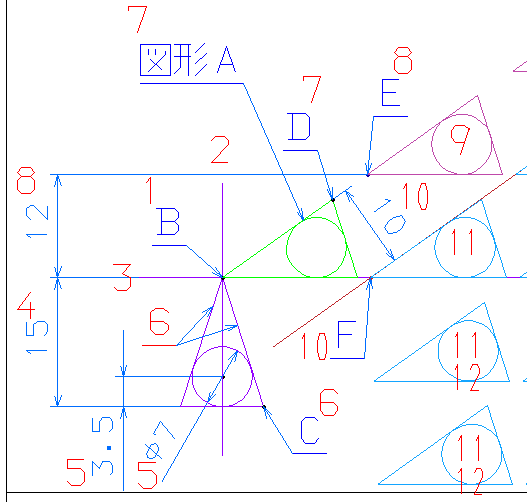 平成13年度(後期) 問 4 作図1.点Bを描く。2.点Bを通る水平線を描く。 3.点Bを通る水平線を描く。 4.3.で描いた水平線に平行で、15mm離れた直線を描く。 5.2.で描いた垂直線上で、4.で描いた直線から3.5mm離れた点を中心点とする、直径7mmの円を描く。 6.点Bを通り、5.で描いた円に接線を描き、4.で描いた直線との右側の交点を点Cとする。 7.点Bを基準として、6.で描いた接線と3.で描いた水平線との角度で、4.,5.,6.で描いた要素を回転移動する。 点Cの移動先を点Dとする。3.,4.,5.を移動した要素を、図形Aとする。 角度を指定する場合、誤差が大きくならないように、2線分を指定する事。(コンピュータが角度を算出。) キーイン入力は、入力桁数が少ない場合や、入力出来るがコンピュータが小さい桁を無視する場合があるので、誤差が大きくなる。 又、入力ミスの可能性もあるので、極力避ける。 ただし、切の良い数値の場合は、キーイン入力の方が誤差が小さくなる。 8.3.で描いた水平線から12mm離れた直線と、直線BDとの交点を点Eとする。 9.点Bから点Eに図形Aを5回平行複写する。 10.直線BDに平行で10mm離れた直線と、3.で描いた水平線との交点を点Fとする。 11.点Eから点Fに9.で描いた図を5回平行複写する。 12.不要な図を削除する。