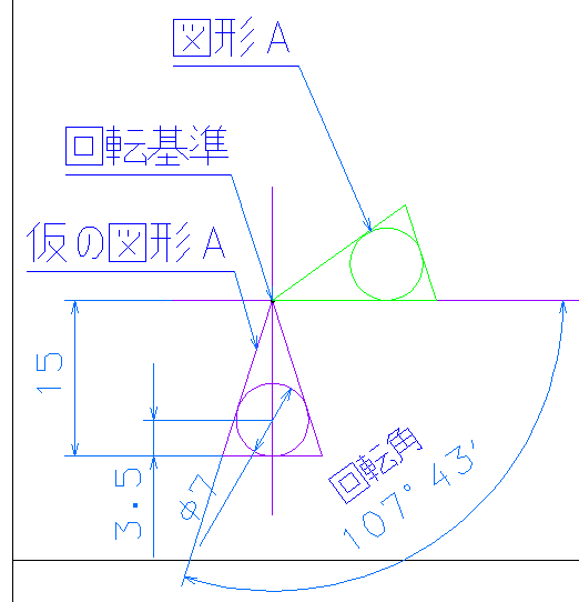 平成13年度(後期) 問 4 解説1.解答の向きに直接描くことが出来ない場合は、任意の向きで仮に描いておき、正式な向きに回転移動する。 角度を指定する場合、誤差が大きくならないように、2線分を指定する事。(コンピュータが角度を算出。) キーイン入力は、入力桁数が少ない場合や、入力出来るがコンピュータが小さい桁を無視する場合があるので、誤差が大きくなる。 又、入力ミスの可能性もあるので、極力避ける。 ただし、切の良い数値の場合は、キーイン入力の方が誤差が小さくなる。