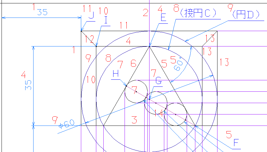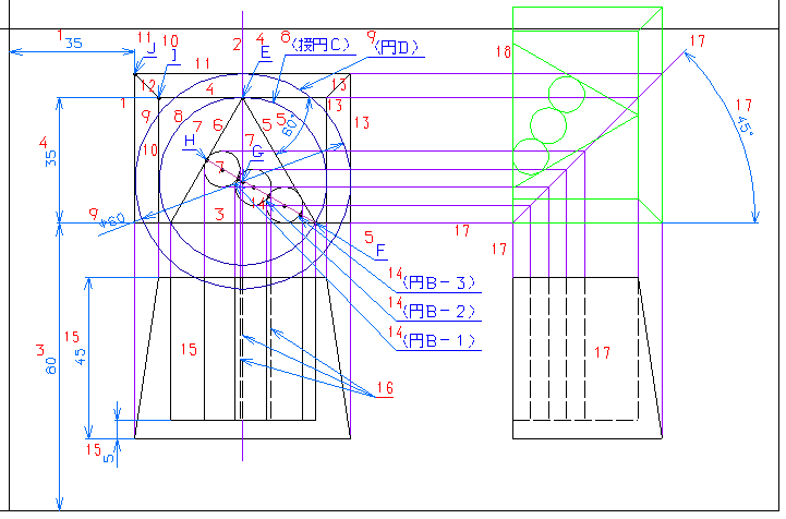 平成13年度(後期) 問 5 作図1.X座標が35の直線を描く。2.1.で描いた直線から、右に30離れた平行線を描く。(円Dφ60÷2。) 3.Y座標が80の直線を描きく。 4.3.で描いた直線から、上に35離れた平行線を描き、2.で描いた直線との交点を点Eとする。 5.点Eを通り、絶対角−60°の直線を描き、3.で描いた直線との交点を点Fとする。 6.2.で描いた直線を基準として、5.で描いた直線を、鏡面複写する。 7.点Fを通り、3.で描いた直線との相対角−15°の直線を描き、2.で描いた直線との交点を点G、6.で描いた直線との交点を点Hとする。 8.点Gを中心として、点Eを通る接円Cを描く。 9.点Gを中心として、直径60の円Dを描く。 10.接円Cの左側に接する、垂直線を描き、4.で描いた直線との交点を点Iとする。 11.円Dの上側に接する、水平線を描き、1.で描いた直線との交点を点Jとする。 12.点Iと点Jを結ぶ。 13.1.と10.と12.で描いた直線を、2.で描いた直線を基準として、鏡面複写する。 14.直線FHを7等分し、各点を円の中心点,接点として、円B−1,2,3を描く。 15.正面図で、各点をそれぞれの高さで描き、点と点を繋ぐ。 16.立体的に捉えながら、隠れ線に変更する。 17.右側面図は、横方向の位置が、平面図の縦方向の位置と同じになるので、お互いの投影から基準線を延長し、その交点を通る45°の直線を描き、その45°の直線に反射させる感じで位置を求める。 18.3.以外の方法として、平面図が完成しているので、右側面図の上に、平面図を90°回転させて移動し、そこから横方向の位置を求める方法もある。 今回の問題では、この方法の方が速い。しかし、通常の作図では、平面図から右側面図,右側面図から平面図へと、双方向に参照するので、3.の作図方法を基本として覚える必要がある。