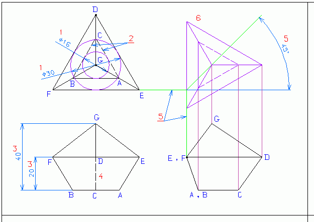 オリジナル 問 2 作図1.平面図を2次元的に描く。2.立体的に捉えながら、隠れ線に変更する。 3.正面図で、各点をそれぞれの高さで描き、点と点を繋ぐ。 4.立体的に捉えながら、隠れ線に変更する。 5.右側面図は、横方向の位置が、平面図の縦方向の位置と同じになるので、お互いの投影から基準線を延長し、その交点を通る45°の直線を描き、その45°の直線に反射させる感じで位置を求める。 6.7.以外の方法として、平面図が完成しているので、右側面図の上に、平面図を90°回転させて移動し、そこから横方向の位置を求める方法もある。 今回の問題では、この方法の方が速い。しかし、通常の作図では、平面図から右側面図,右側面図から平面図へと、双方向に参照するので、5.の作図方法を基本として覚える必要がある。