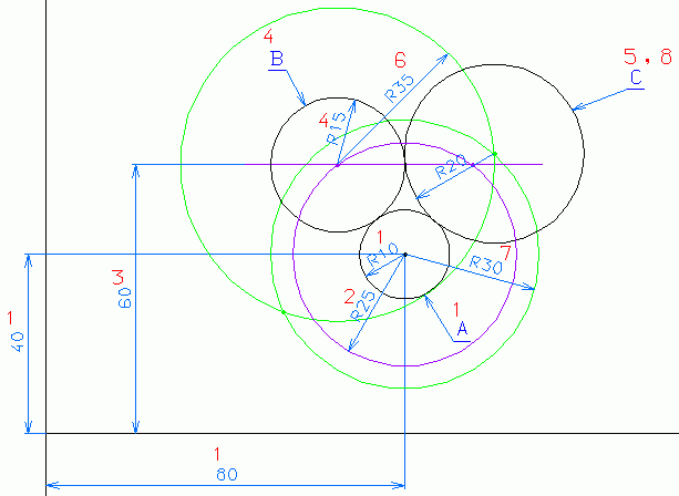 オリジナル 問 8 作図1.区画の左下の角を原点(0,0)とし(80,40)を中心とする円Aを描く。2.円Aの中心を中心とし、円Aと円Bの半径の和を半径とする円を描く。 3.Y座標60mmの線分を描く。 4.2,3.の交点を中心として、円Bを描く。 5.2接,直径指示コマンドで、円Cを描く。 6.参考までに、円Cの別の求め方として、 円Aの中心を中心とし、円Aと円Cの半径の和を半径とする円を描く。 7.円Bの中心を中心とし、円Bと円Cの半径の和を半径とする円を描く。 8.6,7.の交点を中心として、円Cを描く。