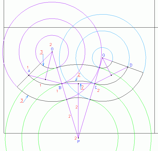オリジナル 問10 解説1.円弧ABは、2点と半径が与えられているので、容易に描く事が出来る。2.円弧BCは、円弧ABとの接点を、滑らかに繋がらなければならないわけだが、 その状態を考えると、接する2円弧の中心点を結んだ線分OP上に、接点Bが存在する事が分かる。 (2円弧を2円として考えると分かりやすい。) この問題の場合は、点O,Bが分かっているので、線分OB上に、点Pが存在する事が分かる。 又、円弧BCは、点B,Cを通るので、線分BCの垂直2等分線上に、円弧BCの中心点Pが存在する事が分かる。 上記2個の条件により、点Pを求める事が出来る。円弧CDも同様の考え方で、求める事が出来る。 3.「両側に配置された曲線は、それぞれ20mm離れているものとする。」 という問題文は、オフセットを表現している。 オフセットとは、曲線ABCDの任意の点から、垂直方向の距離が20mmとなる点の集まり。である事と、 曲線ABCDの任意の点からの最短距離が20mmとなる点の集まり。である。 前者の条件より、後者の条件が優先されるので、前者の条件で求めた要素を後者の条件で、削除する場合がある。 CADによっては、オフセットコマンドが存在するが、後者の条件が考慮されていない場合があるので、注意して使用する事。