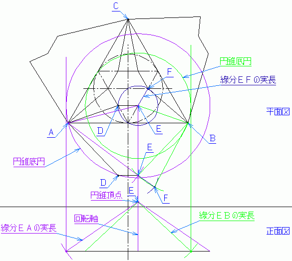 注意点 ・通常展開図は、立体の外面を表にして描くが、CAD利用技術者試験の場合は、立体の内面を表にして描く。 ・通常展開図は、稜線(面が折れ曲がる線)も描くが、CAD利用技術者試験の場合は、描いてはいけない。現在は、指示が無ければ、稜線は実線で仕上げる。らしい。 問題 解答 解説 作図 CAD利用技術者試験トップへ |