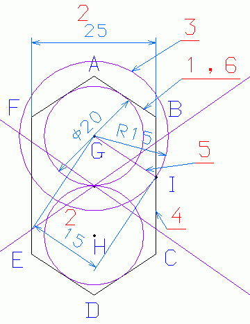 オリジナル 問15 解説1.線分ABは、直接所定の位置に描くことができないので、任意の位置で描き、平行移動する。任意の位置を、点Gとして、線分GIを求め、平行移動する。 2.点Iの条件を抜き出すと、 点Gからの距離が15mmで、 幅25mmの線分BC上に存在する。 2個の条件を、要素に置き換えて、両方満たす位置を求める。 3.点Gからの距離が15mmという条件は、点Gを中心とし、半径15mmの円で表すことが出来る。 4.幅25mmの線分BC上という条件は、そのまま線分BCとして表す。 5.3.,4.の交点を求めると、線分GIを求める事が出来る。 6.線分ABの残された条件は、φ20mmの円に接する事なので、φ20mmの円に接するように線分GIを平行移動する。 平行移動は作図が難しいので、線分GIに平行で、φ20mmの円に接するように、線分ABを描く。