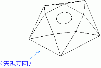 オリジナル 問19問19 立体図(サーフェイスモデル)を基に参考図に示す位置に三面図を完成させなさい。サーフェイスモデル高さは27mmとし、底面の五角形は直径30mmの円に内接する大きさである。 上面の五角形の大きさは直径15mmの円に外接する大きさで、中央に直径8mmの穴が開いている。 正面図は矢視方向を正面にして描きなさい。