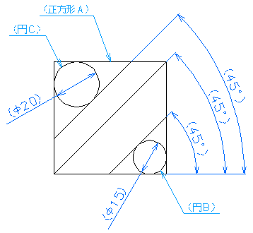 オリジナル 問22問22 立体図(ソリッドモデル)を基に参考図に示す位置に三面図を完成させなさい。ソリッドモデルの高さは40mmである。 底面の正方形Aは、一辺50mmの大きさである。 円Bは、直径15mmの大きさで、正方形Aの2辺に接する。 円Cは、直径20mmの大きさで、正方形Aの2辺に接する。 45°の2本の線分は、円B,円Cにそれぞれ接している。 正面図は矢視方向を正面にして描きなさい。
